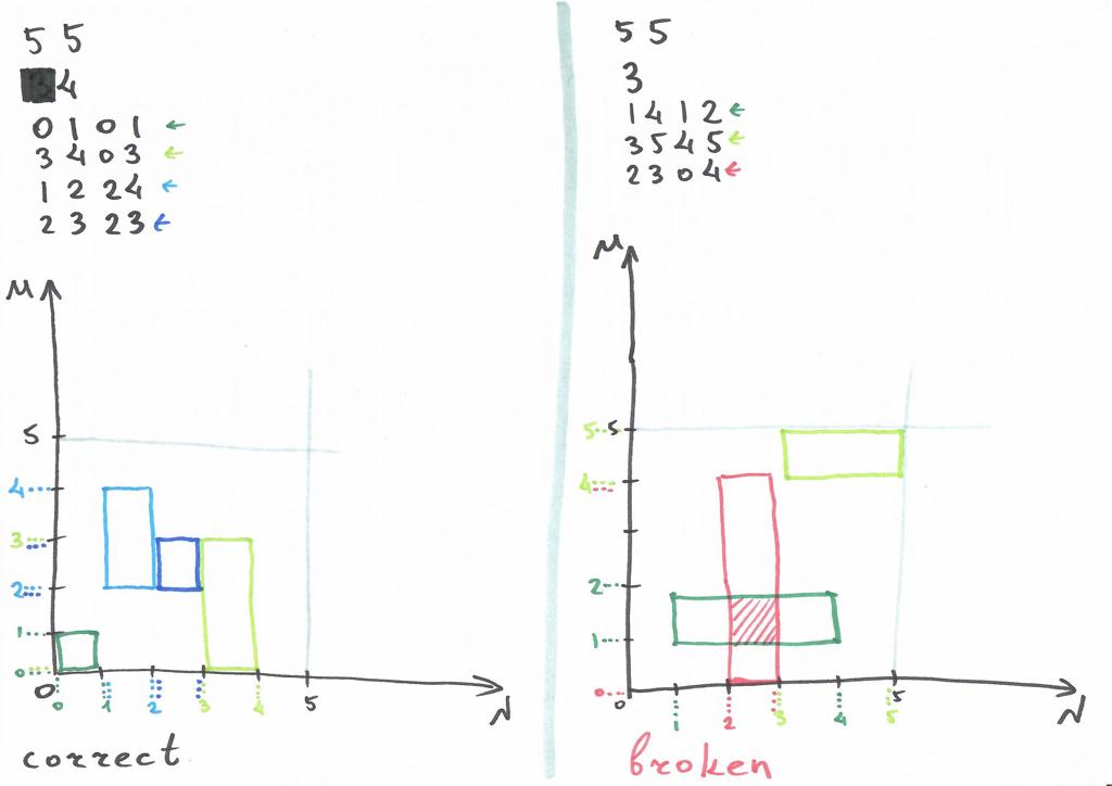 Заданы размеры фасада здания “клеточек”. По оси фасад расположен в интервале по оси в интервале Заданы K штук окон этого здания (каждое окно прямоугольник, нарисованный “по клеточкам” параллельно осям координат). Определить, всё ли в порядке с данным фасадом. Фасад считается не в порядке, если (а) окна вылезают за границы фасада или (б) окна перекрываются между собой. (Окно, прилегающее к границе фасада это нормально. Если окна не перекрываются, но имеют общую границу - так тоже можно. Архитектор художник, он так видит. А современная техника позволяет строить ещё и не такое.)
